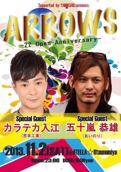 ▲ARROWS▲ -22 Open Anniversary- □Date□ 2013/11/2(SAT) □Open□ 23:00 □Venue□ STELLA☆Utsunomiya □Fee□ ALL 1500yen □Genre□ Mainstream,BillboardHits,EDM,dubstep,Psychedelic,house,J-POP,Dance Music,ALL MIX □Special Guest□ カラテカ入江(吉本興業) 五十嵐 恭雄(あいのり) □Supported□ YAMASHO(AROUND85) □DJs□ IBUKI(GIRLs☆ROCK) misatoo(RIGOLETTO/Gal's collection) MIYAVI(SPARK) URATA(RIGOLETTO) YUMAKO(RIGOLETTO/Gal's collection) ryo-chin(RIGOLETTO) TASAKI(AROUND85)