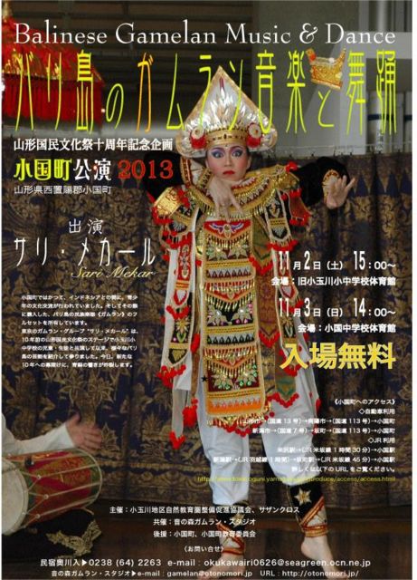 山形国民文化祭十周年記念企画・ガムラン・コンサートのご案内です。 ※山形県小国町ではかつて、インドネシアとの間に、青少年の文化交流が行われていました。そしてその際に購入した、バリ島の民族楽器「ガムラン」のフルセットを所有しています。東京のガムラン・グループ「サリ・メカール」は10年前の山形国民文化祭のステージで小玉川小中学校の児童・生徒と共演して以来、様々なバリ島の芸能を紹介して参りました。今日、新たな10年への幕開けに、青銅の響きが炸裂します。 飯豊連峰に轟く青銅の響き!!ぜひ皆様お越し下さい。 ■日時: