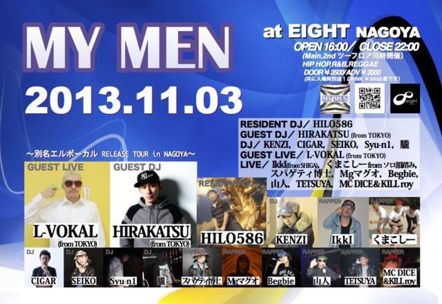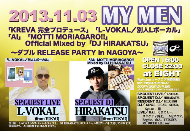 ■11月3日(日) MY MEN vol.152 ~「L-VOKAL/別人Lボーカル」+「AI」「MOTTI MORIAGARO!!」Official Mixed by DJ HIRAKATSU ダブルRELEASE PARTY in NAGOYA~ @EIGHT(ツーフロア同時開催!) HIP HOP,R&B,REGGAE OPEN 16:00/CLOSE 22:00(デイタイム) DOOR ¥2500/ADV ¥2000(共に入場時別途1DRINK ¥500必要です) 【RESIDENT DJ】 HILO586 【GUEST DJ】 HIRAKATASU (from TOKYO) 【DJ】 KENZI,CIGAR,SEIKO,Syu-n1,朧 【GUEST LIVE】 L-VOKAL (from TOKYO) 【LIVE】 IkkI(from SHIGA),くまこしーfr