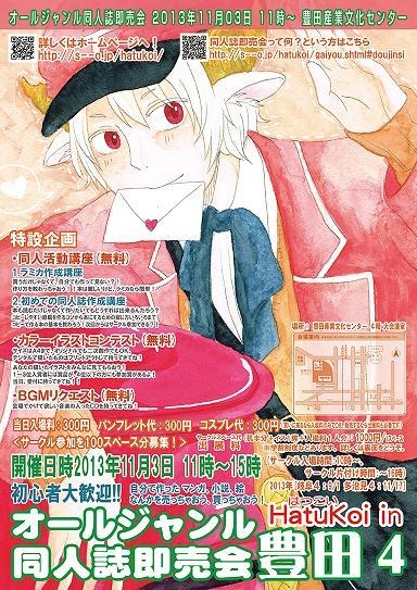 「HatuKoi〜はつこい〜」は、初めての方には気軽に、同人歴のある方には、新鮮な気持ちで参加して頂ける様にと名付けられた、同人活動をこれから始める方への体験型講座、なども行っている、地域密着型の同人誌イベントです。スタッフでの参加も募集しています。 HatuKoi〜はつこい〜 in 豊田4 会場名 豊田産業文化センター 4F 大会議室 会場住所 〒471-0034 豊田市小坂本町1-25 イベント内容 オールジャンル同人誌即売会(コスプレ可) ・募集:直接参加100スペース ・常設企画: 同人活動講座(ラミカ・同人誌作成、など) イラス