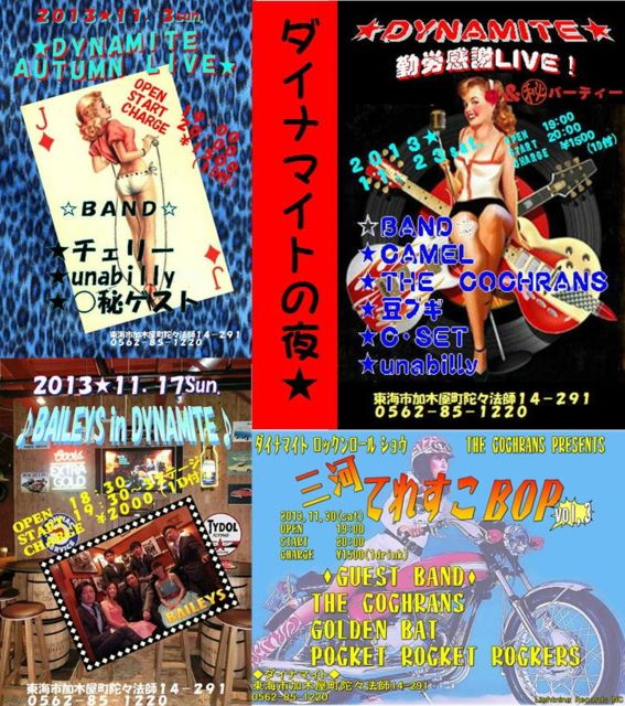 11月もいいねっ♪♪♪♪Happy (ノ^^)乂(^^ )ノHappy♪♪♪♪ 11月3日(日) DYNAMITE ★チェリー ★unabilly ★ROSDOS ★他 OPEN 19:00 START 20:00 CHARGE ¥1500(1D付) ******************************* 11月17日(日) DYNAMITE OLDIES NIGHT ★BAILEYS 3ステージ OPEN 18:30 START 19:30 CHARGE ¥2000(1D付) 0562−
