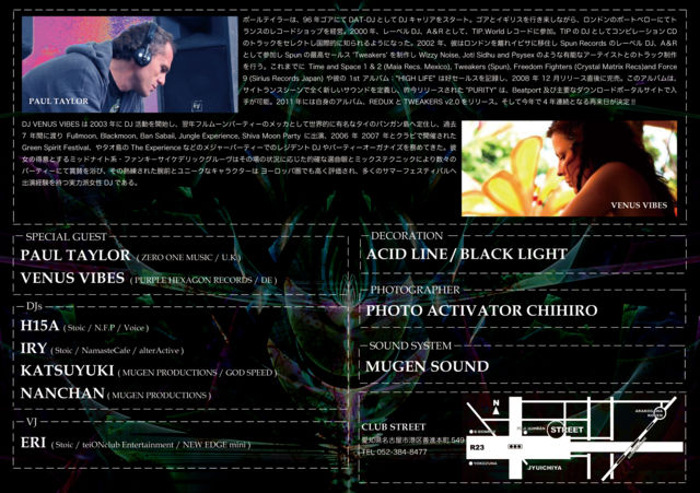 管理人様、告知失礼いたします。 EARTHLING 主宰NEW レーベル "ZERO ONE MUSIC" 世界的シーンに多大な影響を与え続けてきた "GMS, WRECKED MACHINES, SOUNDAHOLIX" 等が在籍する革命的なレーベルから今回、過去に SPUN RECORDS の A&R, レーベルDJ でもあり、2003年最高セールスを記録した "Tweakers" のコンパイル制作を務め、更には RAJA RAM 主宰、TIP.World Records の A&R, レーベルDJ としての経歴を持ち、90年代から多岐に渡りシーンの中核を担ってきた『 PAUL TAYLOR 』が初来名。 そして、Fullmoon, Blackmoon, Ban Sabaii, Jungle