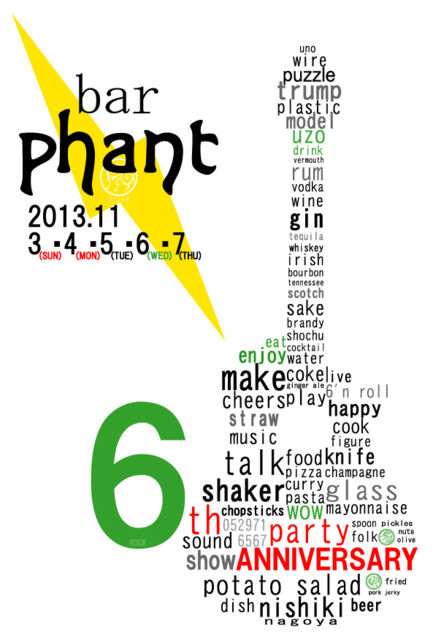 皆様のおかげで『bar phant』は6(ロック)周年を迎えることが出来ました! 感謝の気持ちを込めて11月3日(日)〜7日 (木)の5日間は、毎年恒例のアレをもれなくプレゼント!(^^)! “4日(祝)の月曜日も営業します” もちろん、5日間以外のお祝いも大歓迎で〜す(*^^*) これからもより良いROCKな店になるように頑張っていきたいと思います♪ 今後とも何とぞ宜しくお願いいたしまっす(^^)/ 石田 雄三 ★★★★★★★★★★★★★★ 『bar phant(バー ファント)』 460-0003 名古屋市中区錦3-11-15 ト