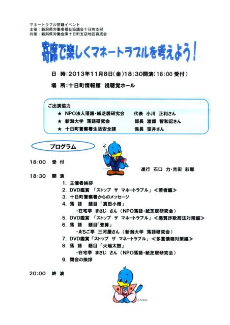 新潟県労働金庫さんの主催で、「寄席で楽しくマネートラブルを考えよう!!」に出演させていただくことが決まりました。 11月8日金曜日18時30分開演。 場所は、十日町情報館視聴覚ホール。 私が2席と新潟大学落語研究会部長ゑちご亭三河屋さんが1席口演します。 お金にまつわるお話をさせていただきます。 協力、NPO法人落語・紙芝居研究会。 http://raku-kami.com (公式ホームページ)