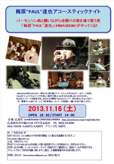 告知失礼します。 八王子で回を重ねてまいりましたPAULアコが西日本初お披露目になりました!! 近隣の方はぜひ♪ ---------------- 梅原”PAUL”達也(44MAGNUM)アコースティックナイト パーキンソン病と闘いながら命懸けの歌を魂で歌う男 「梅原"PAUL"達也」(44MAGNUM)がやってくる!! 44MAGNUMのPAULとは一味もふた味も違うアコースティックなPAULワールドへご招待。 PAULのフェイバリットソングを美しい歌声と楽しいMCを交えお楽しみいただけます。 当日はアンケートを配布予定。あなたの質問にもPAULとメンバーがお答え