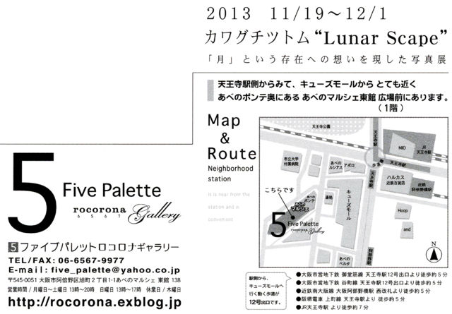 皆さん、 初めまして。 今年の1月末に東京の渋谷にて月の写真の個展を開催した者ですが、 今度は地元の関西で同様の作品展を催すことになりました 「月」という存在への想いを、 様々なシチュエーションで撮影した写真によって表現する展示会です。 会場のギャラリーでは、 大きくプリントした20点ほどの月の作品を展示したり、 ポストカードなどの販売も行います 入場は無料ですので、 お近くにお住まいの方はぜひご覧になりに来て下さい また↑の画像にあるような案内ハガキ(DM)もありますので、 ご希望