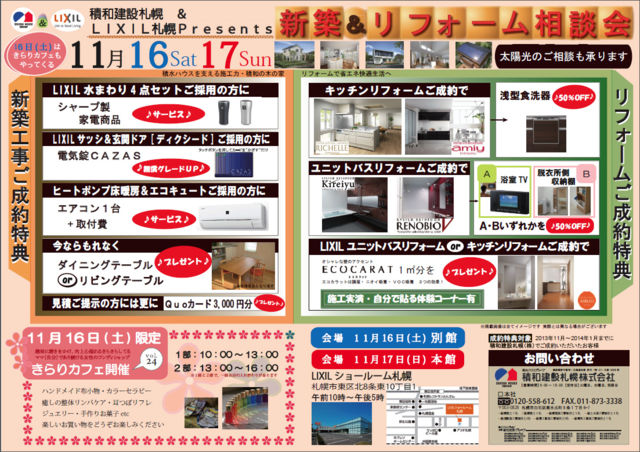 ※11月1日更新 イベントチラシ完成しました。 こちらの写真を保存して印刷していただいてもいですが画像が荒いので 高データーが欲しい方は auranagasawa@yahoo.co.jpまでご連絡ください。 また紙面での複数枚郵送も可能ですので、メッセください。 入場無料・出入り自由となっております。 @@@ 11月16日(土) 場所はアリオ向かいのリクシル(別館)です。 正面向かって、左側の棟です。 札幌市東区北8条東10丁目1 今回も積和建設さまとのコラボイベントです。 参加表明はこちらにお願いします。 当日急な参加