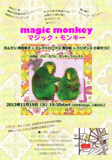 火曜夜の投げ銭ライブ、しばらく振りの登場です。どうぞよろしくお願いいたします!! ◉2013年11月19日(火)19:30start(30分を2stage、入替えなし) 『マジック・モンキー magic monkey 〜〜ガムラン 櫻田素子 & エレクトロニクス 春日聡 & バリダンス 小泉ちづこ 』 南国バリ島 摩訶不思議音楽ガムラン 魅惑のバリダンス 天から降る黄金の光 木陰から猿が覗く 虹が出ている 雲の上に 踊れ踊れ マジック・モンキー ☆ライブ・チャージは、お気持ちにお任せの投げ銭制。 美味しいイ