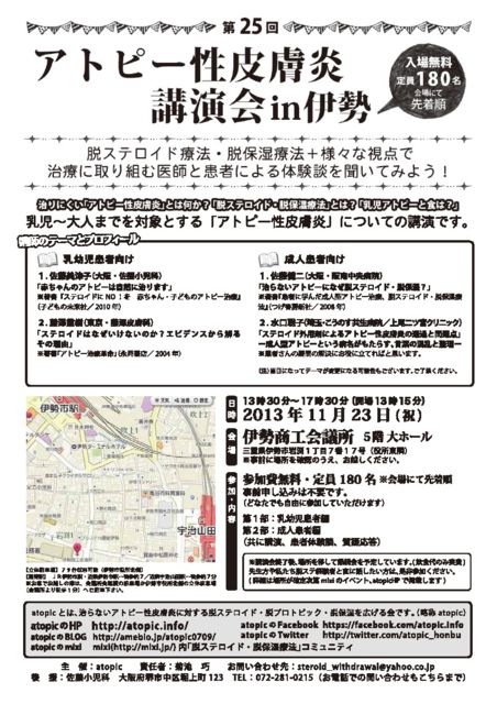 告知が大変遅れて申し訳ございません。「第25回アトピー性皮膚炎講演会in伊勢」の後、場所を移しまして先生を交えての懇親会を開きます。 私たち脱ステ経験者、そして先生方も参加されますので、この機会に気兼ねなく、色々ご質問していただき交流を深められたらと思います。 日時:11月23日(祝)午後18:00〜20:00くらいまで予定。 場所:遊食酒房たか屋伊勢店 住所:三重県伊勢市岩渕1-16-10(宇治山田駅西口出口から徒歩約3分) 予算:コース料理飲み放題付き3500円 予約人数:20名 参加表明:atopicまたはmixi。