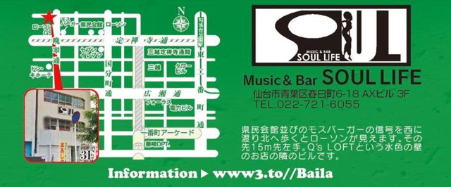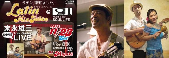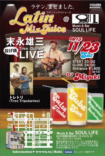 場所は青葉区春日町、音楽が好きな人たちの集まる隠れ家的なバーSOUL LIFEにてDJ★MIYUKIがみなさんを踊らせます。お酒の種類も豊富で、音も確かなSOUL LIFEでラテンのミックスジュースをお楽しみ下さい。 今回は東京から日本のサルサの伝道師の一人、末永雄三さんをゲストにトレスギターのライブを行います。 トレトリの二人(室本香子&本城久志)が末永氏をサポートします。当日はどっぷりキューバの香りをお楽しみ下さい。 尚、エントランス料金は変わりませんが「投げ銭ライブ」形式をとりますのでご協力をお願い致します。 音楽好きの