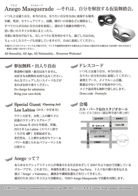 2013年11月23日(土)19:00-20:30 (開場18:00) Nov.23[sat]19:00-20:30 [open 18:00] ※チラシに誤りがありました。×[FRI]→○[SAT]です。 エル・パーク仙台スタジオホール (141BLD [仙台三越定禅寺通り館] 6F) 参加無料/出入自由 Anego Masquerade −それは、自分を解放する仮装舞踏会。 いつもとは違う自分、本当の自分、なりたい自分を自由に表現する場所。 年齢、性別、セクシュアリティ、国籍、障がいの有無などに関係なく、 すべての人が自由に自分自身を表現し、認め合う素敵な時間です。 思い思いのスタイルを身にまとった