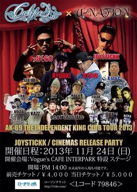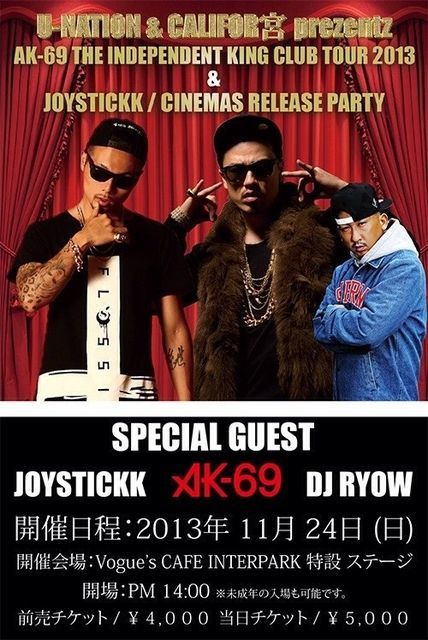 CALIFOR 宮 × U-NATION prezentz 【〜AK-69 THE INDEPENDENT KING CLUB TOUR 2013〜& 〜JOYSTICKK / CINEMAS RELEASE PARTY〜 】 ◇開催日程:2013年 11月 24日 (日) ◇開催会場:Vogue’s CAFE INTERPARK 特設 ステージ ◇開場:PM 14:00 ◇料金◇ ・前売チケット / ¥4,000 ローソンチケット/<Lコード 79846> ・当日チケット / ¥5,000 ◆SPECIAL RELEASE GUEST◆ AK-69 JOYSTICKK ◆SPECIAL GUEST◆ DJ RYOW DJ RYUUKI ◆DJ◆ GEE-麺 X sta C MAD-K COLOR JINX RYO-HEY
