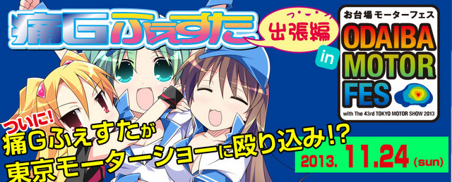 http://www.geibunsha.co.jp/mook/ita/ 2013年11月の車イベントといえば…そう! 「東京モーターショー」! 会場を幕張メッセから東京ビッグサイトに移し、その規模を拡大していく東京モーターショー。今年はそのビッグサイト周辺でサテライトイベント「お台場モーターフェス」が実施されます。 そしてなんと!そのモーターフェスの会場の一部を「痛Gふぇすた」が占拠しちゃいます! いつものお台場で、いつもとちょっと違った「痛Gふぇすた出張編inお台場モーターフェス」にクルマを展示してみませんか? エントリーフィーは無料です!どしど