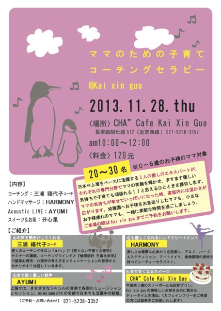 0歳から6歳までのお子様ママを対象にした癒しのイベントです コーチングサロン『air』で、怒らない子育て心理学のセミナー講師をしている 三浦 禧代子コーチとのグループコーチング 毎週土曜日、静安区のJAZZ BARで歌っているシンガー AYUMIのアコースティックライブ 2児の母で、先月、本格仕事復帰したばかりのビューティーセラピスト HARMONYのハンドトリートメント 上海ではおなじみの”CHA”Cafe KaiXinGuoさんの特製スイーツ&お茶 癒しのエキスパートが、それぞれの専門分野でママに幸せなひととき