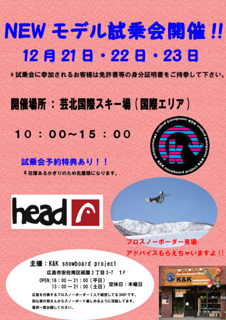 12月21〜23日芸北国際スキー場(国際エリア)にて 13-14NEWモデルの試乗会を開催します。 ・自分に合う板がわからない。 ・スノーボードは板の長さが大事だと思っている。 ・なかなか上達しない。 ・ボードによって何が違うかわからない。 などなど、スノーボードの特性についてわからない方もたくさんいると思います。 プロスノーボーダーがやさしく教えますので是非是非皆さんこの機会にお越しください。 参加費:無料(プロスノーボーダー来場でアドバイスもらえちゃいます) 参加ブランド:head/SP 時間:10:00〜15: