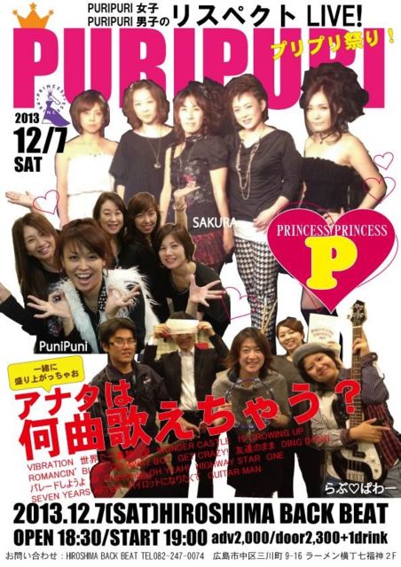 管理人様、貴重なスペースをお借りします。 これまで、関東や関西ではこう言ったイベントも多く、私も何度か顔を出しましたが、それぞれ素晴らしいライブ、素晴らしいイベントでした。 そして、今年、広島でもプリプリのコピーバンドイベントが行われます。 ライブが飛ばされやすい広島。 しかし、出演バンドは、本家に負けない、広島でやるオリジナリティとかで、各バンド意気込んでいます。 関東、関西からは遠いですが、ここに告知しておきます。 また広島在住で、昨年の興奮が忘れられない人や、状況などライブに行けなかった人もいるか