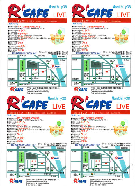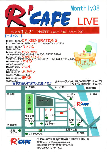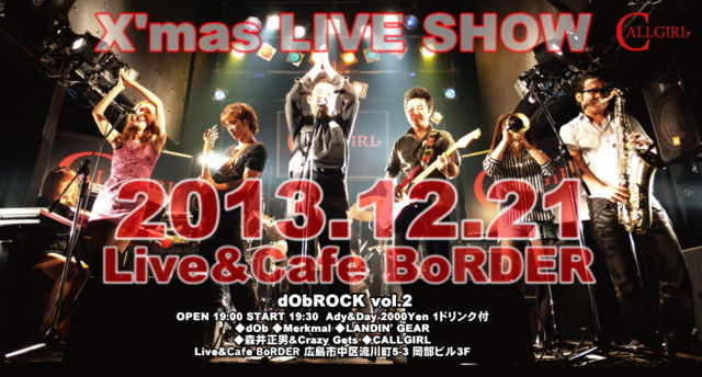 ■2013.12.21(Sat) Live&Cafe BoRDER 「dObROCK vol.2」 ◆dOb ◆Merkmal ◆LANDIN' GEAR ◆森井正男&Crazy Gets ◆CALLGIRL OPEN 19:00 START 19:30 Ady&Day 2000Yen 1ドリンク付 □お問合せ Live&Café BoRDER 広島市中区流川町5-3 岡部ビル3F CALLGIRLにて絶賛チケット販売中!!