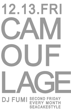 2013年度の締めくくりカモフラなので これを見てくれた人ふらっとシーケークに足を運んで 一杯飲みながらふわふわFUMIワールドMUSICを聴きながら 良い空間を過ごしてくれれば嬉しいい! 宜しくでーす! 2013-12/13-FRI CAMOUFLAGE DJ FUMI START23:00-3:00 NOCHARGE