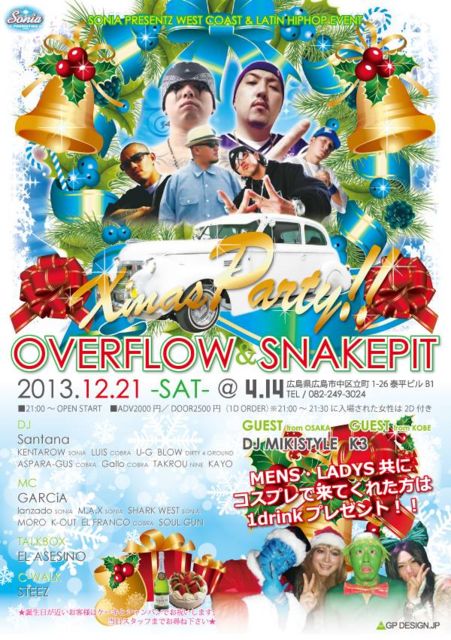 ☆SONIA PRESENTZ☆ 『OVER FLOW&SNAKEPIT 〜X'mas PARTY!!〜 』 2013/12/21(SAT)広島@4.14 21:00〜OPEN START ADV2000円、DOOR2500円(1D ORDER) ※21:00〜21:30に入場された女性は2D付き *MENS、LADYS共にXmas的なコスプレで来てくれた方は1drinkプレゼント!! GUEST DJ MIKISTYLE(OSAKA) K3(KOBE) DJ Santana(SONIA) KENTAROW(SONIA) LUIS(COBRA) U-G BLOW(DIRTY 4 GROUND) ASPARA-GUS(COBRA) GALLO (COBRA) TAKROU(NINE) KAYO MC GARCiA(SONIA) lanzado(SONIA) M.A.X (SONIA) SHARK WEST (SONIA) MORO