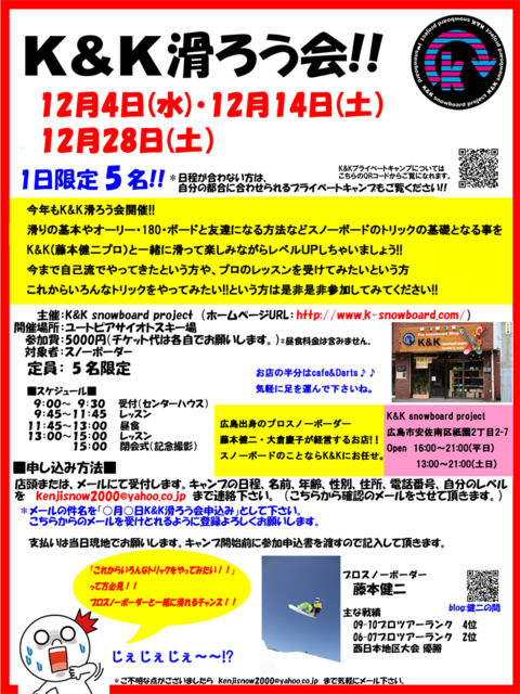 ■□■□■□■□■□■□■□■□■□■□■□■□■□■□■□■□ プロスノーボーダー藤本健二によるスノーボードキャンプ。 今年も「K&K滑ろう会」開催決定!! 今年は色んなトリックや技にチャレンジしてみたいって方は是非参加してみて下さい。 オーリー、グラトリにチャレンジしちゃいましょう!! これから色々トライしてみたいという方は是非参加して下さい!! ☆皆さん一緒に楽しみましょう☆ 主催: K&K snowboard project(URL:http://www.k-snowboard.com/) 場所: ユートピアサイオトスキー場(広島県)