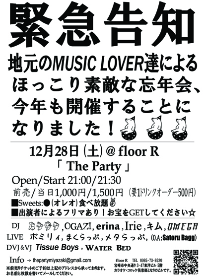 ≪管理人さま、スペースお借りします≫ ****************************** 12/28(土)@floor R 【 The Party 】 Open/Start 21:00/21:30 前売/当日 ¥1,000 / ¥1,500 (共に+1D¥500) ■Sweets:●(オレオ)食べ放題 ■出演者によるフリマあり ▼DJ ・スケサク ・OGAZI ・erina ・Irie ・キム ・OMEGA ▼LIVE ・ポミリィ ・まくらっぷ ・メタらっぷ ・Satoru Bagg(O.A) ▼DVJ&VJ ・Tissue Boys ・Water Bed ▲info → thepartymiyazaki@gmail.com ※チケット予約はお名前と枚数と連