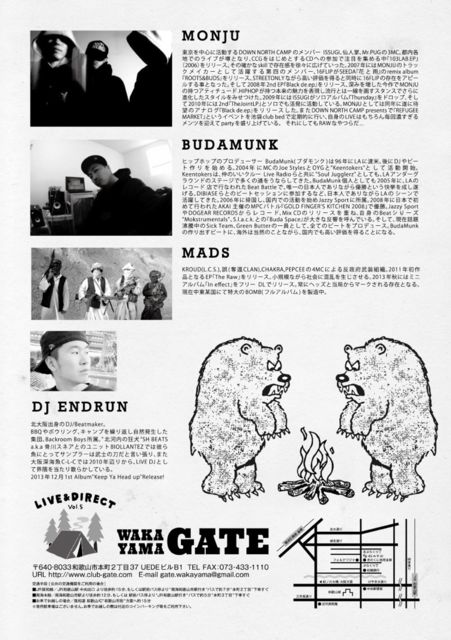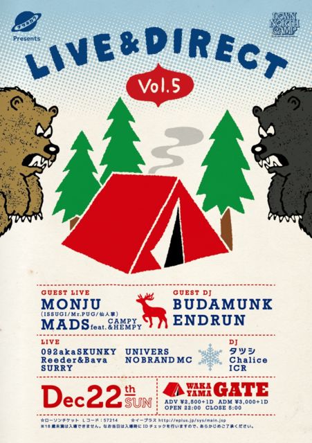 MONJUが和歌山にやってくる!!!! ナサキカクpresents『LIVE&DIRECT vol.5』 12/22(日) 和歌山GATE 22:00〜5:00 前売り 2500円 当日 3000円(ともに別途1D500円) Guest Live MONJU(ISSUGI/Mr.PUG/仙人掌) MADS Guest DJ BUDAMUNK ENDRUN Live 092 aka SKUNKY Reeder & Bava SURRY UNIVERS NO BRAND MC DJ タツシ chalice ICR 前売りはローソンチケット(Lコード57214)かイープラス、またはambie.nasakikaku@gmail.comまでお名前と枚数をお知らせください★