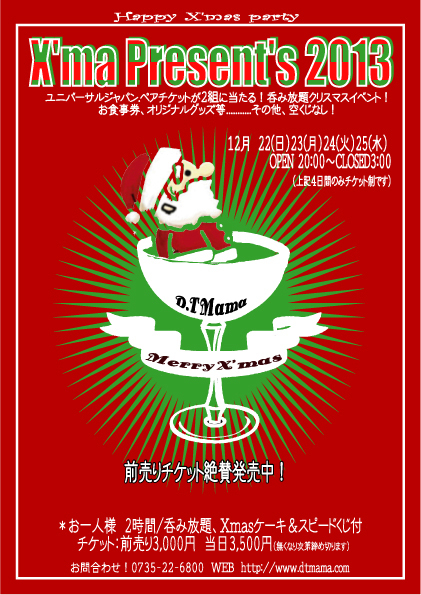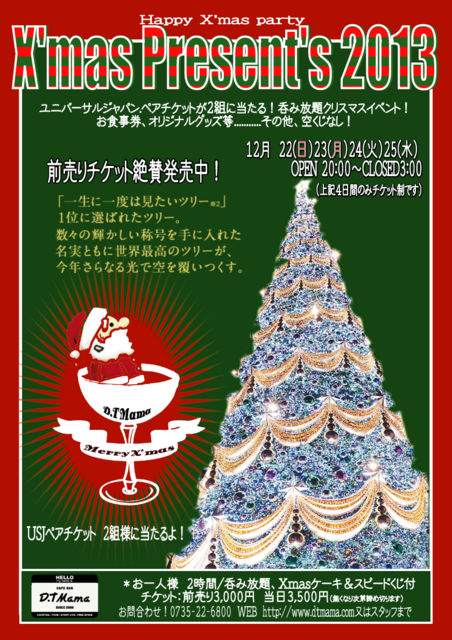 今年もやります!クリスマス特別企画、なんと2時間呑み放題で お一人様3000円さらに来店と同時にくじ引きを引いてなんと ユニバーサルジャパン(USJ)ペアチケット2組など豪華景品プレゼント! 今年は数もそろえ何があたるかお楽しみ! 豪華景品が外れてもオリジナルグッズ等、空クジなし 今年の2013'年クリスマスは、呑んだくれましょう。 友達お誘いの上お待ち申し上げます。 忘年会によし、飲み会もよし、 カップルもよし、.... チケット絶賛発売中! (お早めにお買い求めください) お一人様(いずれか一日限り)2時間飲み