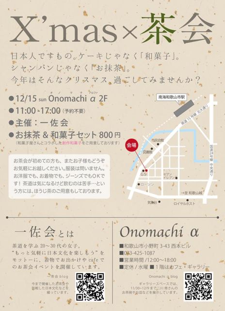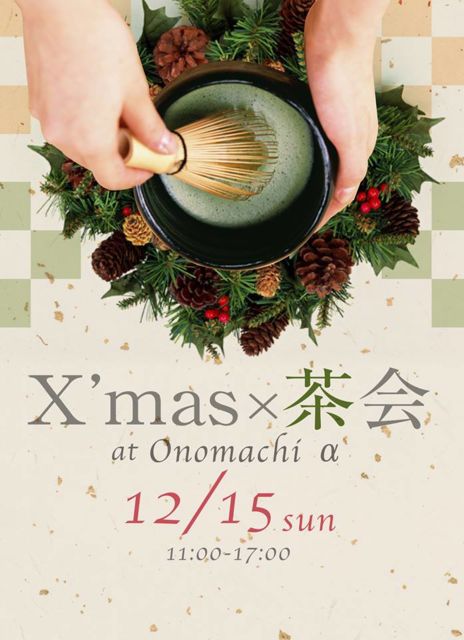 2013年12月15日(日曜)登録有形文化財の西本ビル「cafe&ギャラリー onomachi α」さん2階にてカフェスタイルのお茶会を行います! クラシックな建物でおしゃれな空間で、毎回素敵な展示やカフェを楽しめましたが 残念ながら今月末でonomachiαさんは閉店されるそうです。 是非、最後にこのすばらしい空間を一緒に楽しみませんか?? 皆様にいつもと違ったクリスマスを楽しんでいただけるよう、この日のための特別な和菓子、またこの日のために揃えた器や茶器を用意してお待ちしています。 茶道はじめての方でも気軽に楽しんで