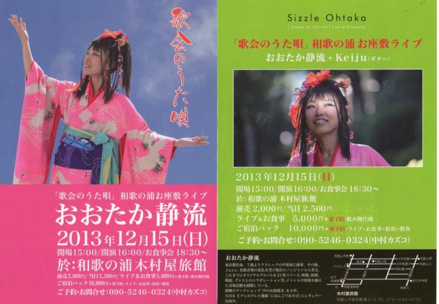 【おおたか静流 和歌の浦お座敷ライブ】 「歌会のうた唄」 出演;おおたか静流(うた)、Keiju(ギター) 2013年12月15日(日) 木村屋旅館 (和歌山市新和歌浦2-2 Tel. 073-444-0155) 開場 15:00 / 開演 16:00 お食事会 18:30〜 *お食事会への参加は事前にご予約が必要です *ご宿泊を希望されるお客様は事前の宿泊予約をお願いいたします 料金 ライブ 前売 2,000円 / 当日 2,500円 ライブ&お食事 5,000円(要予約・飲み物代別) ご宿泊パック 10,000円(要予約・ライブ+お食事+宿泊+朝食) ご予約・お問合せ: 090-5246-032