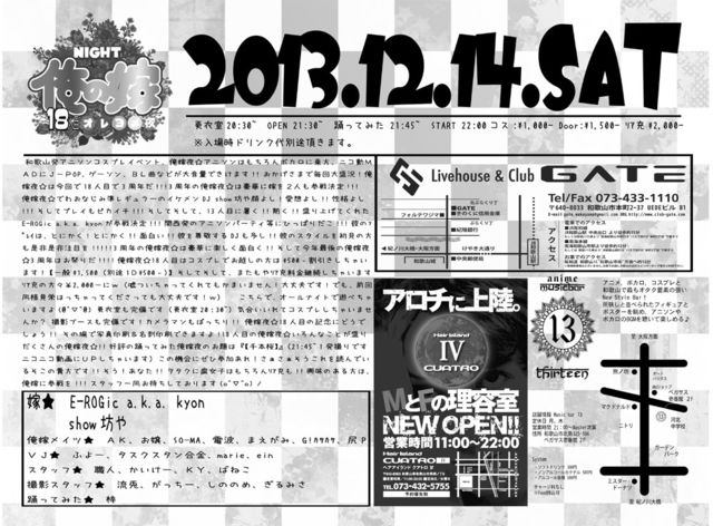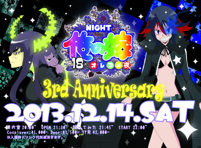 2013,12,14 SAT更衣室20:30~ OPEN 21:30~ 踊ってみた 21:45~ START 22:00~ Cosplayer:\1,000- Door:\1,500- リア充\2,000- ※入場時ドリンク代別途頂きます。 嫁★ E-ROGic a.k.a. kyon show坊や 俺嫁メイツ★ AK、お嬢、SO-MA、電波、まえがみ、G!カサカサ、尻P VJ★ ふよー、タスクスタン合金、ルビ多、marie、ein スタッフ★ 職人、かいけー、KY、ばねこ 撮影スタッフ★ 流兎、がっちー、しののめ、ぎるみさ 踊ってみた★ 梓 18 人目踊ってみたは 【千本桜】 和歌山発アニソンコスプレイベン