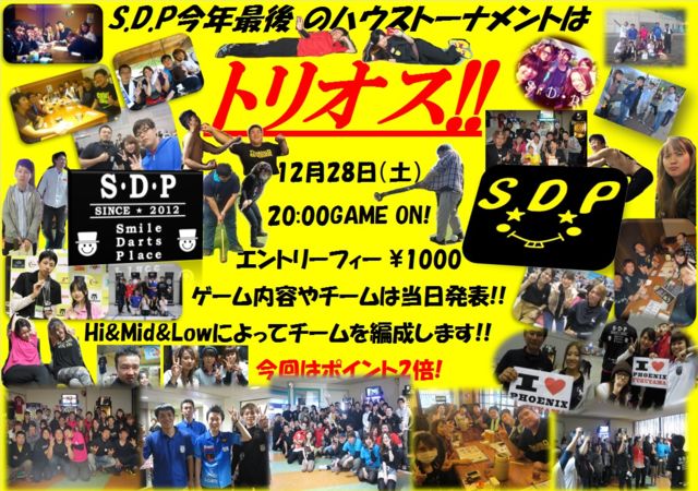 2013年最後のハウストーナメントはトリオスで開催します!! ・12月28日(土) ・20:00 GAME ON! ・エントリーフィー \1000 ・Hi&Mid&Lowにてチームを編成します ・ゲーム内容、チームは当日発表 ・エントリー定員 30名 ・エントリー〆切 当日18:30 年末で忙しいと思いますが、お時間ある方はぜひぜひ参加してみてください☆ みんなに楽しんでもらえるハウスになるようスタッフ一同がんばります!!