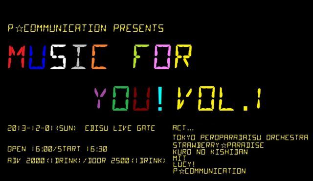 P¡ùcommunic@tion¼çºÅ¤Î¥¢¥Ë¥½¥ó¥¤¥Ù¥ó¥È¤ò³«ºÅ¤·¤Þ¤¹¡ù*:.Ž¡. o(¡æ¢¦¡å)o .Ž¡.:*¡ù ¡ù¥¤¥Ù¥ó¥È¥¿¥¤¥È¥ë¡§ P¡ùcommunic@tion¡¡Presents ¡ÖMUSIC for you!! VOL.1¡× ¡ùÆü»þ¡§2013/12/01 ¡ù²ñ¾ì¡§·ÃÈæ¼÷LIVE GATE¢Íhttp://www.livegatetokyo.com/access/ ¡ùOPEN 16:00/START 16:30 ¡ù½Ð±é(½Ð±é½ç) ¡¦Åìµþ¤Ú¤í¥Ñ¥é¥À¥¤¥¹¥ª¡¼¥±¥¹¥È¥é(¥¢¥Ë¥½¥ó¥¹¥«¥Ð¥ó¥É) ¡¦Strawberry¡ùParadise(»¨¿©·Ï¥¢¥Ë¥½¥ó¥Ð¥ó¥É) ¡¦¹õ¤Îµ³»ÎÃÄ(»¨¿©·Ï¥¢¥Ë¥½¥ó¥Ð¥ó¥É) ¡¦Mit(¥¢¥³¡¼¥¹¥Æ¥£¥Ã¥¯¥¢¥Ë¥½¥ó¥Ð¥ó¥É) ¡¦Lucy!(ºäËÜ¿¿°½¥È¥ê¥Ó¥å¡¼¥È¥Ð¥ó¥É)