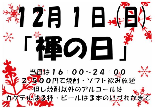 紅白の出場歌手の発表もされ、 忘年会や年末の行事の話題もちらほら上がるようになってきて、 師走が間近になってくると、いよいよ今年もあと僅かと、 みなさん慌ただしくなるかと思いますが、 『スナック光』月一イベント『褌の日』でちょっと一息つきませんか? ってことで12月も下記の日程でイベントを開催しま〜す。 ◆◇◆◇◆◇◆◇◆◇◆◇◆◇◆◇◆◇◆◇◆◇◆◇◆◇◆◇◆◇ 次回は『12月1日』に開催♪ 開催時間は前回同様16:00〜24:00 会費は2,500円で焼酎・ソフト飲み放題!