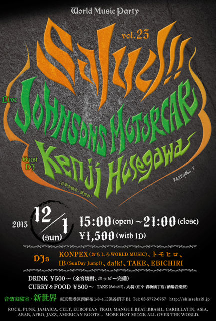 RUSTICじゃないけど、IRISHでキメる!! 【Salud!! VOL.23】 2013.12.1(SUN) 15:00(open)〜21:00(close) ¥1,500(with 1D) 【PLACE】 音楽実験室・新世界 http://shinsekai9.jp/ 東京都港区西麻布1-8-4 三保谷硝子B1 Tel:03-5772-6767 【FOOD】 CURRY&more (¥500〜) 【DRINK】 500円〜 (金宮焼酎、ホッピー完備) 【LIVE】 Johnsons Motorcar (http://johnsonsmotorcar.wix.com/jmcpage) 【GUEST DJ】 長谷川賢司(音楽実験室 新世界) 【DJ】 KONPEX IB(オーガニックラジオ) da!k! トモ
