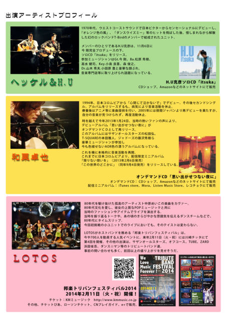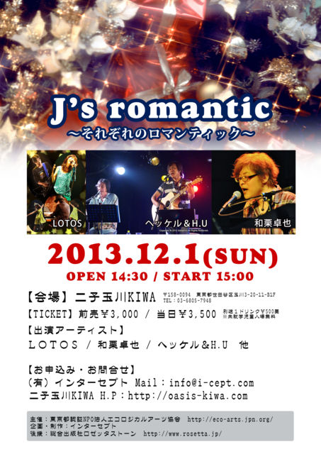 ヘッケル&H.U さんが下記のイベントに出演されます ライブ後は、 H.Uさんのニューアルバムの販売も行いますので、 是非皆さん、お越し下さい。 (お買い求め頂いた方にはサインをして下さるそうです) 『J’s romantic 〜それぞれのロマンティック〜』 日程: 2013年12月1日(日) 時間: 開場14:30/開演15:00 料金: 前売¥3,000/当日¥3,500 (ドリンクチケット\500別途・全自由・整理番号なし) ※ 未就学児童無料 【出演】 LOTOS / 和栗卓也 / ヘッケル&H.U <イベント詳細> http://o