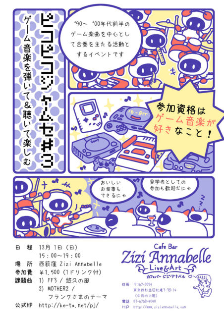 この場をお借りして告知させていただきます! ゲーム音楽好きの演奏者のためのセッションイベント、 「ピコピコジャムセ」の第3回を来る 12/1(日) に開催いたします! 演奏者、見学者ともに募集いたします! お申し込みは、下記の公式ホームページからのみ可能です。 http://ke-ta.net/pj/ 下記にイベント情報を記載しますので、ご興味のある方は是非ご参加ください♪ ◆イベント概要 「ピコピコジャムセ」は、主に90年代〜00年代前半のゲーム楽曲を中心とした セッション(合奏)を主たる活動とするイベントです。 本イベントは