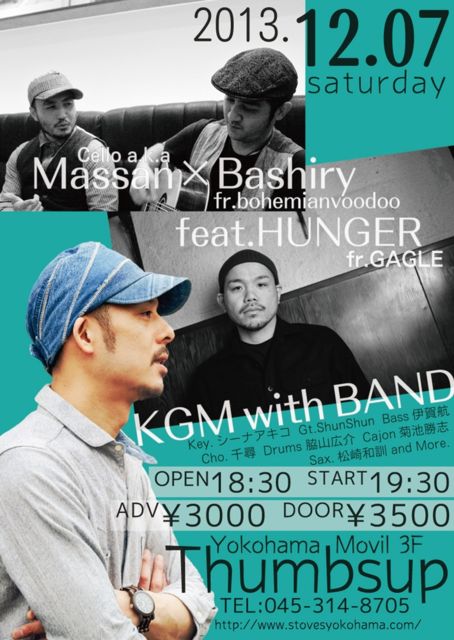 お見逃しなく! 12/7(土)横浜THUMBSUP「TROUBADOUR」 OPEN 18:30 LIVE START 19:30 ADV \3000/ DOOR \3500 LIVE: ・Cello a.k.a Massan×Bashiry(bohemianvoodoo) feat. HUNGER(GAGLE) ・KGM & BAND E.Gt: ShunShun/Key: シーナアキコ/Bass:伊賀航/Cajon: 菊池勝志/Sax: 松崎和訓/Drums: 脇山広介/Chorus:千尋 ご予約メールフォーム https://ssl.form-mailer.jp/fms/827d71db274244 ※前売料金でのご予約は6日までとなります お電話でのご予約&お問合せ Thumbsup 横浜市西区南幸2-1-22 相鉄Movil3F TEL 045-314-8705 ※お