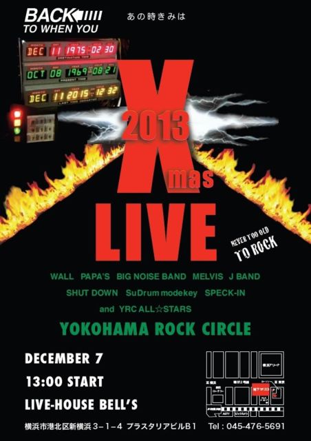 恒例のYRCクリスマスライブ2013は12月7日に開催します。 今年のYRCバンドの総決算、大奉仕です! 音楽・イベント好きの皆様、沢山のご来場をお待ちしてます! イベント名 : 横浜ロックサークル Xmas LIVE 2013 日 時 : 2013年12月7日(土)13:00〜17時頃 会 場 : LIVEHOUSE BELL'S 横浜市港北区新横浜3-1-4 プラスタリアビルB1 (新横浜駅より徒歩5分/アリーナ前)Tel:045-476-5691 入場料 : \1,500.(1ドリンク付き) 出演バンド : WALL、PAPA's、MELVIS、J BAND、