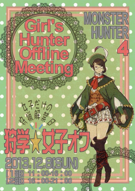 MH4が発売して早3ヶ月・・・ 女子ハンターのみなさま、 大変長らくお待たせいたしました! ついにあの【女子限定イベント】再び!! 大盛り娘 (Riku*&おかゆ) Presents … 狩学 MH4 女子オフ 女子ハンターの 女子ハンターによる 女子ハンターのためのイベント いつもは漢らしいハンターで賑わう 狩学の日曜日ですが、 この日限りは男性ハンターさん入店禁止ですごめんなさい>< 「オフ会とか行った事ない(´・ω・`)」って方も 「そもそもパーティープレイしたことな