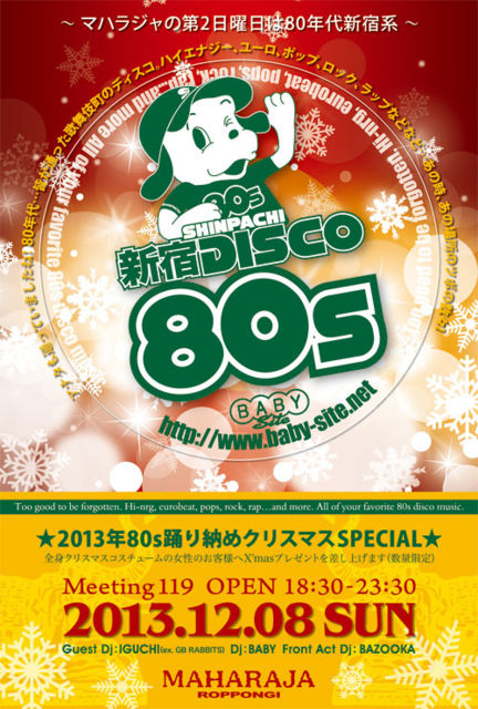 『SHINPACHI新宿DISCO80s』 ★2013年80s踊り納めクリスマスSPECIAL★ 全身クリスマスコスチュームの女性のお客様へX'masプレゼントを差し上げます(数量限定) ノリは勿論80年代新宿系(^^)v 12/8(日)18時半より六本木マハラジャに大集合! ▼ディスカウントゲスト登録24時間受付中▼ ディスカウント料金でご入場出来る、ゲスト登録を24時間受付中です。 メール送信で、 1.開催日、2.お名前(フリガナ)、3.人数 をお伝え下さい。 初めての方も、お一人様からグループまで、どなたもお早めにどうぞ! (※mixiまたはFacebook