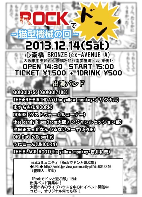 Ƭ¤Ç¤Ã¤«¤Ç¡Á¤«¢öºã¤¨¤Æ¥Ô¥Ã¥«¥Ô¡Á¥«¢ö¡Ê¹ç¤Ã¤Æ¤Þ¤¹¡¦¡¦¡¦¡©¡Ë º£Ç¯ºÇ¸å¤Î¡ÖRock¤Ç¥É¥ó¡×³«ºÅ¤·¤Þ¤¹¡ª ¡Ö Rock¤Ç¥É¥ó£´ Ç·¿µ¡³£¤Î²ó ¡× ¡ý²ñ¾ì¡¡OSAKA LIVE HOUSE BRONZE(ex-AVENUE A) ¢¨1¡¡¡Ê http://avenuea.jp/ ¡Ë ¢©542-0086 ¡¡Âçºå»ÔÃæ±û¶èÀ¾¿´ºØ¶¶2-11-7Æîú²°Ä®¥Ó¥ë Åì¦1F ¥¢¥¯¥»¥¹¡Ê http://avenuea.jp/access/ ¡Ë Ãϲ¼Å´¸æÆ²¶ÚÀþ¡¦¿´ºØ¶¶±Ø 7Èֽиý ÅÌÊâ5ʬ Ãϲ¼Å´»Í¤Ä¶¶Àþ¡¦»Í¥Ä¶¶±Ø±Ø 5Èֽиý ÅÌÊâ5ʬ ¶áÅ´ÆñÇÈÀþ¡¦¶áÅ´ÆñÇ鱯 25Èֽиý ÅÌÊâ10ʬ ¡ý¥Á¥±¥Ã¥È¡¡1,500±ß¡ÊÁ°Çä¤ê/ÅöÆü¶¦¡Ë+£±¥É¥ê¥ó