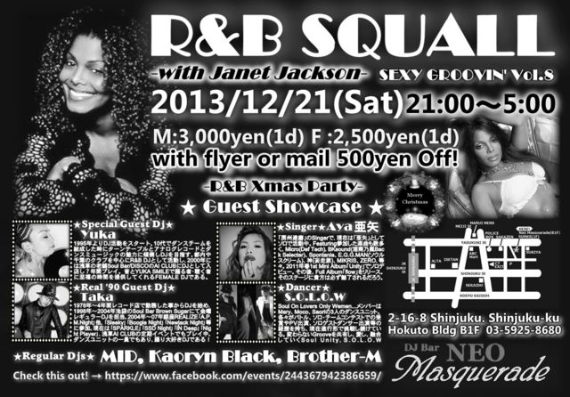 2013年のクリスマスイブ・イブ・イブ♬w 皆様いかがお過ごしのご予定でしょうか?! R&Bがお好きでしたら是非♬ 元祖☆R&B DiVA Janet Jacksonをテーマに ステキな夜をご一緒しませんか?! 2013/12/21(Sat) 21:00〜5:00 @新宿NeoMasquerade R&B SQUALL ~Sexy Groovin' Vol.8~ With Janet Jackson M:3000Yen(1d) F :2500Yen(1d) with flyer or mail 500Yen off! 今年も華やかに☆豪華に☆ 素晴らしいゲストの皆様とご一緒に 夢の一夜をお届け致します♬ 今回のピックアップアーティストが Female、という