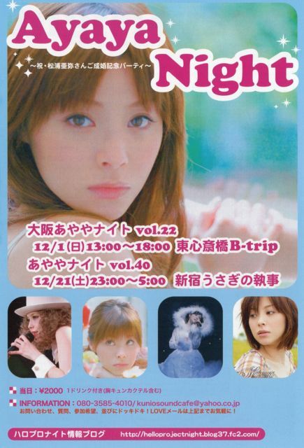 お世話になっております。 東は松浦亜弥ちゃん久々のディナーショー2days終了後のオールナイト、 “東京あややナイト” が交流&踊り足りない気持ちを満たす空間をご用意! 両日ともに盛大に参りますのでお付き合い頂けますと嬉しいです! “東京あややナイトVol.40” 〜祝・松浦亜弥さんご成婚記念・ディナーショーアフターパーティ!〜 日時:2013年12月21日(土) 23:00〜All Night! 会場:Private Salon うさぎの執事 070-6651-4010/090-9850-2819 http://c.mixi.jp/usaginoshitsuji 住所:東京都新宿区百人町1-12-