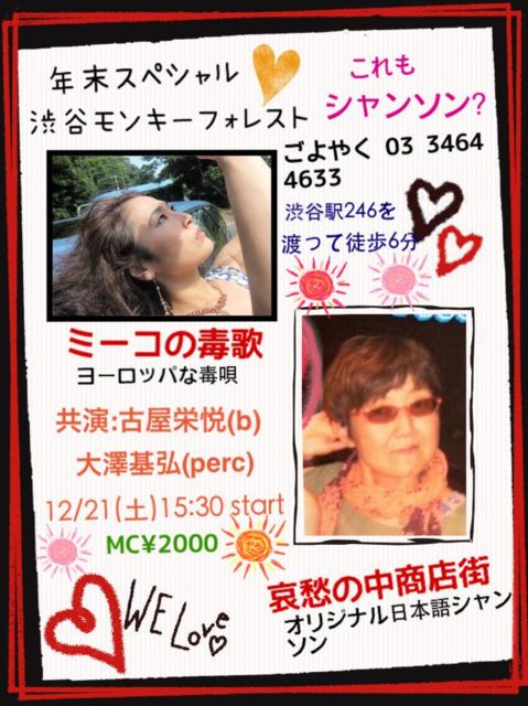 「愛の讃歌」や「ろくでなし」じゃない、あなたが今まで聴いたことのないシャンソン。 あるときは、どこかで目にした日常のワンシーンであったり、 またある時は、日常を逸脱した修羅場であったり。 それは、あなたが生きる人生であると共に、生きたかもしれない人生の記憶。 5月に好評を博した、mico(諸星公子)と哀愁の中商店街(中浩美+大澤基弘)が贈る、 ヌーヴェル・シャンソン第二弾! micoの「毒歌」コレクション ブレヒトソング、フレンチ・ポップ、シコ・ブァルキ(ブラジル)など、 めくるめく愛の修羅場を描く、オ