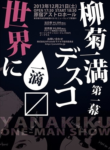 ヤナキク初の「ワンマンライブ、開催決定! 詳細は http://yanakiku.jp/live.html ↓↓↓↓↓↓ 満を持して、ヤナキクが2014年の世界進出に向け、 ワンマンライブを決行! 世界に羽ばたく YANAKIKU を、皆様で応援して頂き、門出を祝って頂ければ幸いです。 当日は、皆様が盛り上がる様々な演出、おもてなしをご用意しておりますので、是非、ご来場ください! 詳細はこちら! http://yanakiku.jp/live.html YANAKIKU ONE-MAN SHOW 柳菊一満デスコ 第一幕 〜世界に一滴マス〜 ■日時:2013年12月21日(土) ■場所:原宿アス