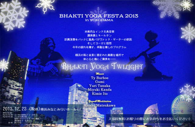 2013年12月23日(祝)、横浜みなとみらいホール・レセプションルームにて、 バクティヨーガフェスタ2013in横浜を開催いたします。 本格的なインド古典音楽とキールタン、そしてヨーガと瞑想。 一年の疲れを癒す、ぜいたくな時間を横浜でお過ごしください。 ☆バクティヨーガ Twilight☆ http://www.bhaktiyoga-festa.com/ 日時:2013年12月23日(祝) Doors open/ 14:30〜 Part1 start/ 15:00〜 ヨーガと瞑想(workshopは無料です。ご予約ください。) 上映会&ティーブレイク