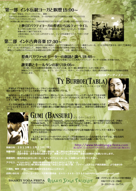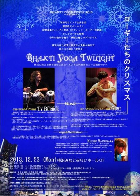 2013年12月23日(祝)、横浜みなとみらいホール・レセプションルームにて、 バクティヨーガフェスタ2013in横浜を開催いたします。 本格的なインド古典音楽とキールタン、そしてヨーガと瞑想。 一年の疲れを癒す、ぜいたくな時間を横浜でお過ごしください。 ☆バクティヨーガ Twilight☆ http://www.bhaktiyoga-festa.com/ 日時:2013年12月23日(祝) Doors open/ 14:30〜 Part1 start/ 15:00〜 ヨーガと瞑想(workshopは無料です。ご予約ください。) 上映会&ティーブレイク