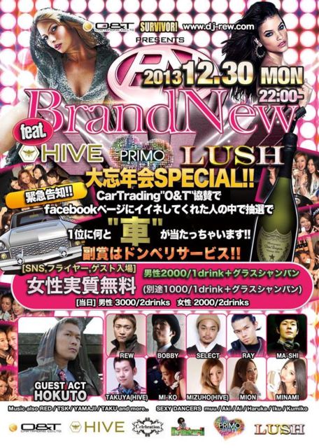 管理人様失礼致します。 エントランスにて(ミーコのゲスト)と言って頂ければ何名様でも最安値ディスカウント料金女性1000円1ドリンク+グラスシャンパン付き実質無料 男性2000円1ドリンク+グラスシャンパン付きでご入場頂けます。 12.30(月)"BrandNew@六本木HIVE"年末大忘年会SPECIAL!!売れっ子DJ達の奇跡の祭典!!HIVEで満員御礼の大人気イベントが集結!!Facebookイベントページ『イイネ!』でなんと"車"1台プレゼント!!日頃の感謝を込めてシャンパン,テキーラ,日本酒大量振る舞い!! ☆DJ HOKUTO,REW,BOBBYなどageha,camelot,HIVEで回す超一