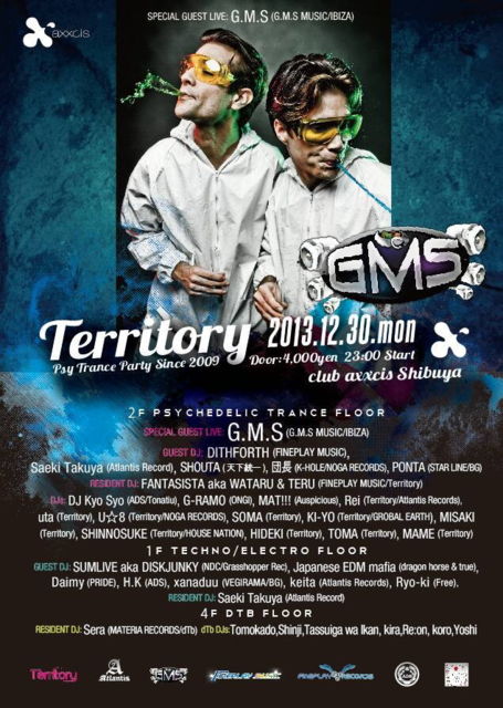 12月30日(月)渋谷axxcis G.M.S Japan Tour〜 Territory SPECIAL 2013 大忘年会 【Territory SPECIAL】 〜2013 大忘年会 G.M.S Japan Tour〜 受付で団長のゲストと 言って頂くかこの画面の提示で ディスカウントになります ☆★☆GMS☆★☆ 【Rounders】 →http://youtu.be/ameGbvYdDqg ☆★☆DITHFORTH☆★☆ 【The Beach】 →http://youtu.be/6qUFJSAi2Rw No,1パーティ【Territory】が 2013年の締めくくりに、【大忘年会】を開催︎ 2Fフロアにはなんと! PSYCHEDELIC TRANCE界において、常に最先