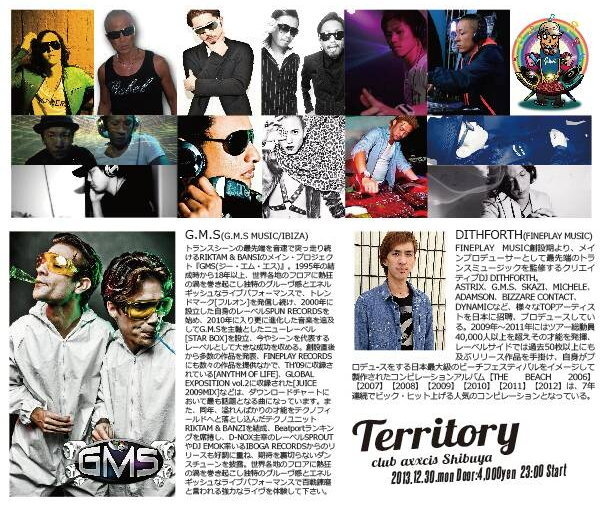 12月30日(月)渋谷axxcis G.M.S Japan Tour〜 Territory SPECIAL 2013 大忘年会 【Territory SPECIAL】 〜2013 大忘年会 G.M.S Japan Tour 受付で団長のゲストと 言って頂くかこの画面の提示で 3000円の激安ディスカウントになります ☆★☆GMS☆★☆ 【Rounders】 →http://youtu.be/ameGbvYdDqg ☆★☆DITHFORTH☆★☆ 【The Beach】 →http://youtu.be/6qUFJSAi2Rw No,1パーティ【Territory】が 2013年の締めくくりに、【大忘年会】を開催︎ 2Fフロアにはなんと! PSYCHEDELIC TRAN